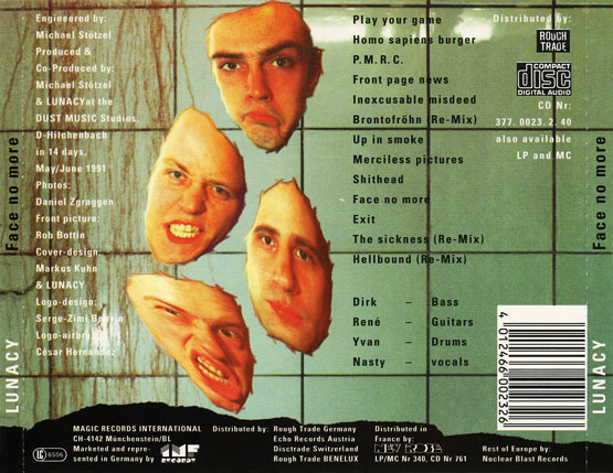 Lunacy была основана в 1988 году двумя братьями, Рене (гитара) и Дирк (басс). Вокалист и барабанщик были найдены быстро. Через год последовал первый концерт, и первое демо. Группа стала очень популярна в швейцарском андеграунде. Они играли на разогреве у таких групп, как Sodom и Coroner. Три года спустя Lunacy сели в студию и записали свой первый официальный 4-трековый мини-LP "Sickness". Этот диск получил признание и за пределами Швейцарии. В 1991 году записали полноформатник "Face no more". Отличный альбом. В то время как все утяжелялись и ускорялись, эти ребята выдавали припанкованный, немного завернутый треш, ближе к кроссоверу, местами напоминающий Voїvod или Coroner. Короче, Швейцария.С 1995 года полезли в умняки, музыка стала более рафинированной, появились клавиши, электроника... Believe? 1995 года еще куда не шло, альбом интересный. Полный пиздец пришел с появлением нового вокалиста в 2000 году (не ЕПишке этого года еще волает старый вокалист Nasty), из оригинального состава осталось 2 человека, добавился гитарист и вместо треша и угара появился какой-то Дрим Теятр. Хотя, возможно для кого-то это будет интересно. В общем начните с "Face no more".