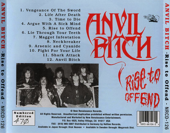 После выхода двух сборников, "Thrash Metal Attack" (1985) и "Speed Metal Hell II" (1986), с участием Anvil Bitch на New Renaissance Records, группа в 1986 году отправилась в Пенсильванскую студию для записи своего дебютного альбома, получившего название "Rise to Offend". В поддержку альбома ребята отыграли множество концертов, а также открывали выступления таких грандов, как Exodus, King Diamond, Overkill и Motorhead. Во время длинного списка концертов c 1986 по 1987 год в поддержку альбома, группа завербовала блестящего ведущего гитариста по имени Херб. (Фото Херба появилась в оформлении альбома, но он не принимал участия в создании материала.)